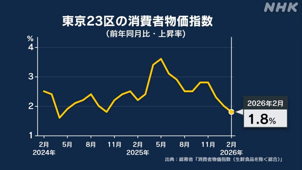 東京23区 2月の消費者物価指数 上昇率が2%を下回り1%台に