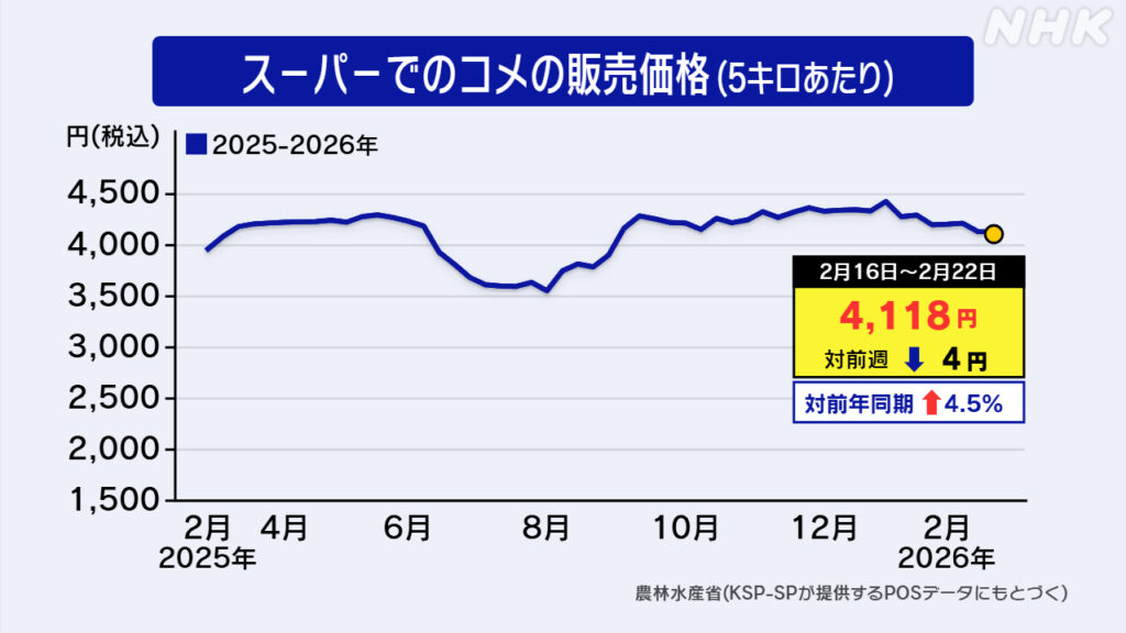 スーパーのコメ平均価格 5キロ4118円 前週より4円値下がり