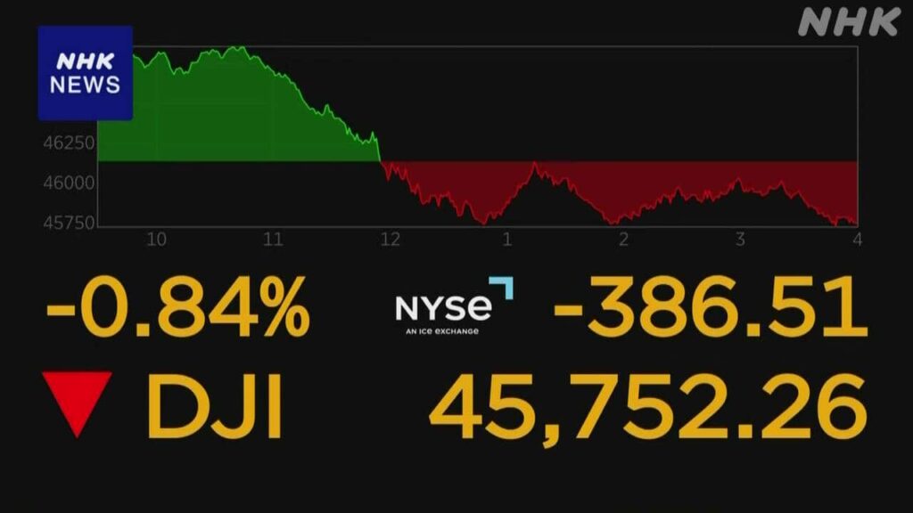 NYダウ 380ドル超の値下がり 一転して売り注文広がる
