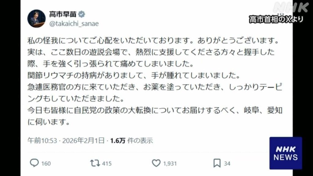 高市総理大臣は、衆議院選挙の遊説中に手を痛めて治療を受けた{... -