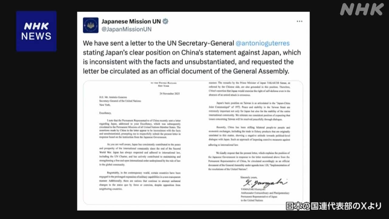 「台湾有事」めぐり 中国に反論する書簡を日本が国連に送付