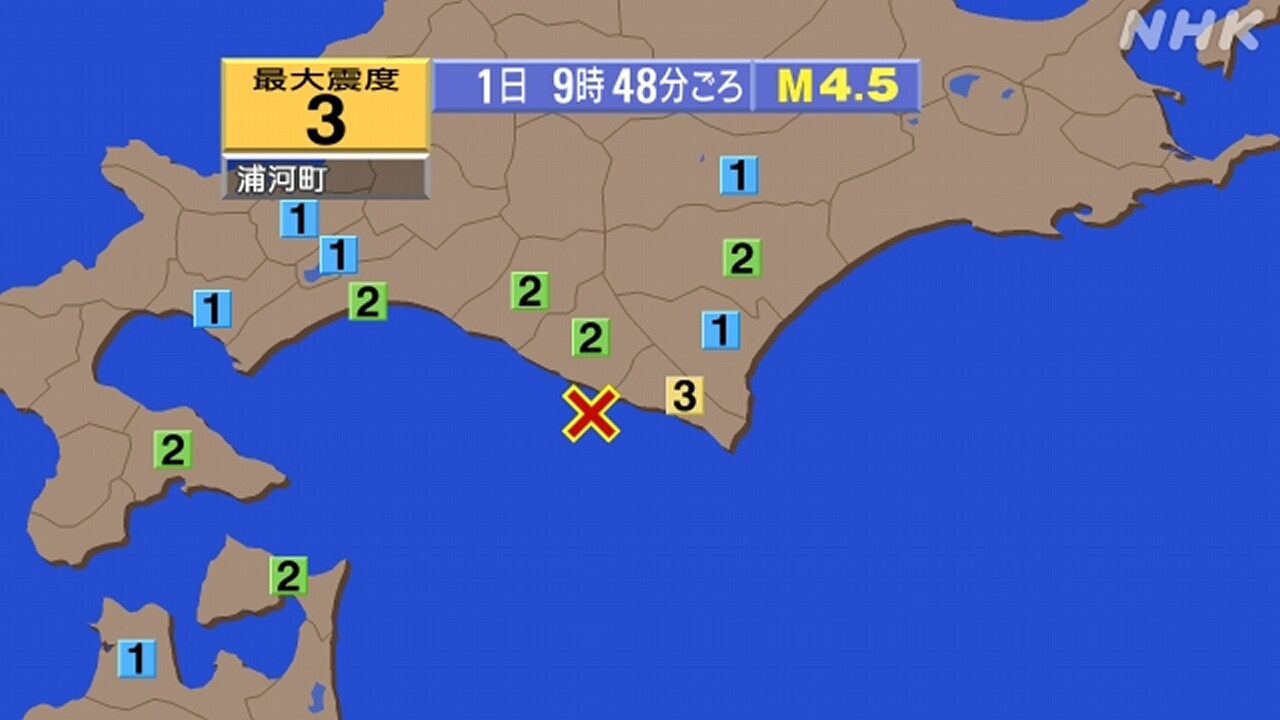 震度3の揺れを北海道浦河町で観測したほか、震度2や1の揺れを北海道と青森県、岩手県の各地…