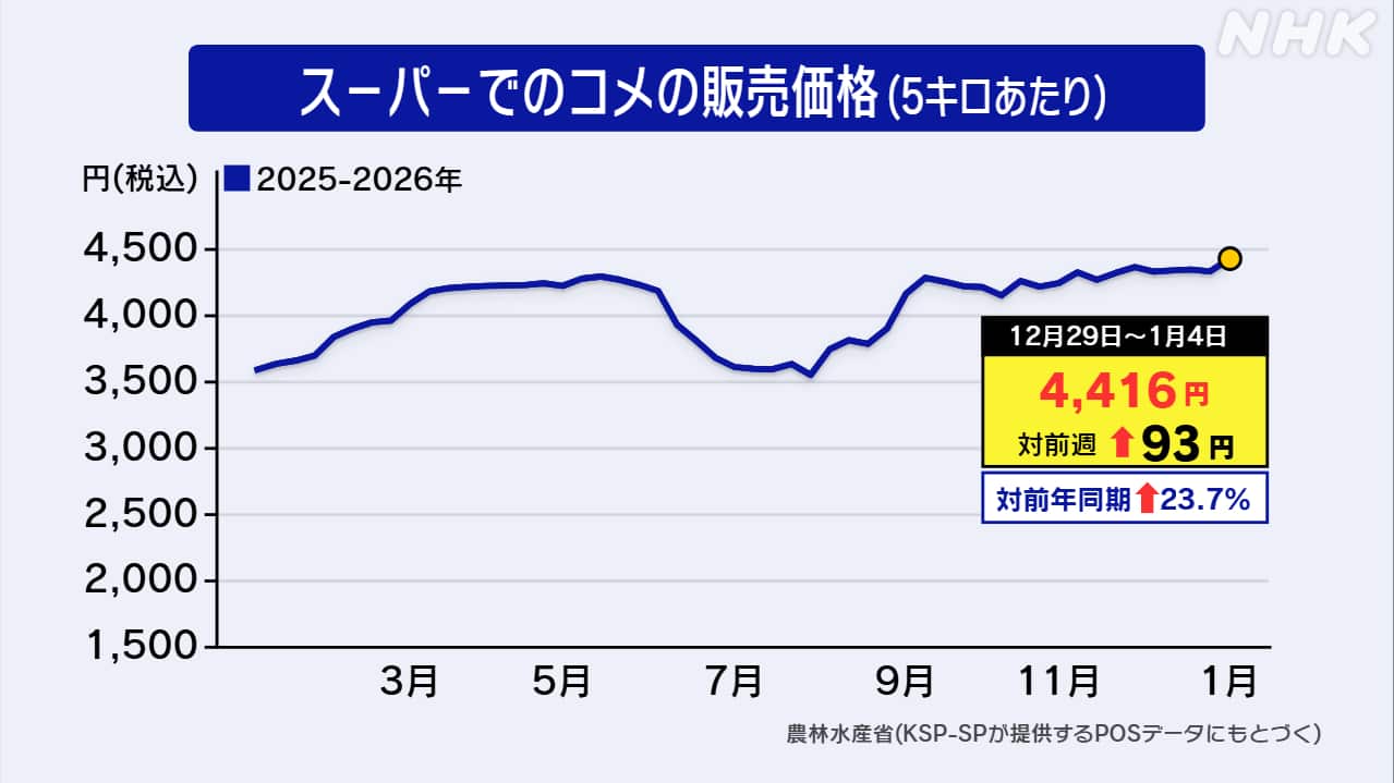 全国のスーパーで1月4日までの1週間に販売されたコメの平均価格は5キロ当たり税込みで4416円と、前の週より93円値上がりしました。値上がりは2週ぶりで、最高値を更新しました。