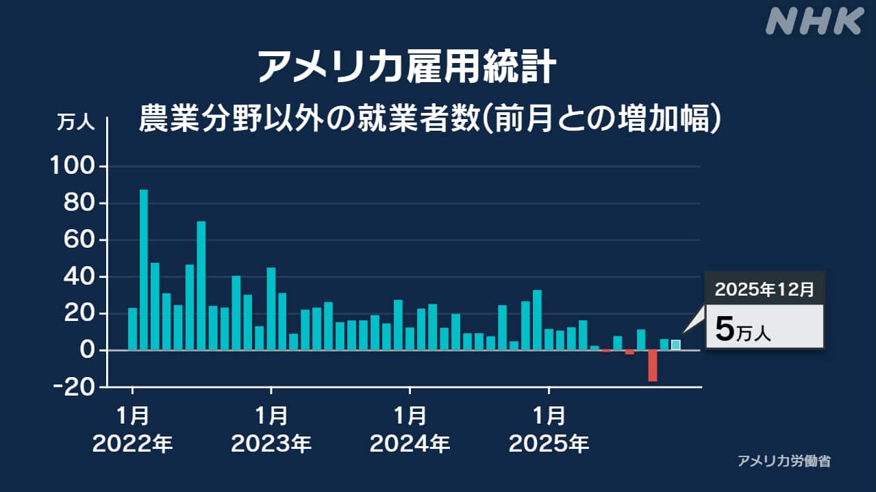 米 12月雇用統計 就業者は前月比5万人増も市場予想下回る