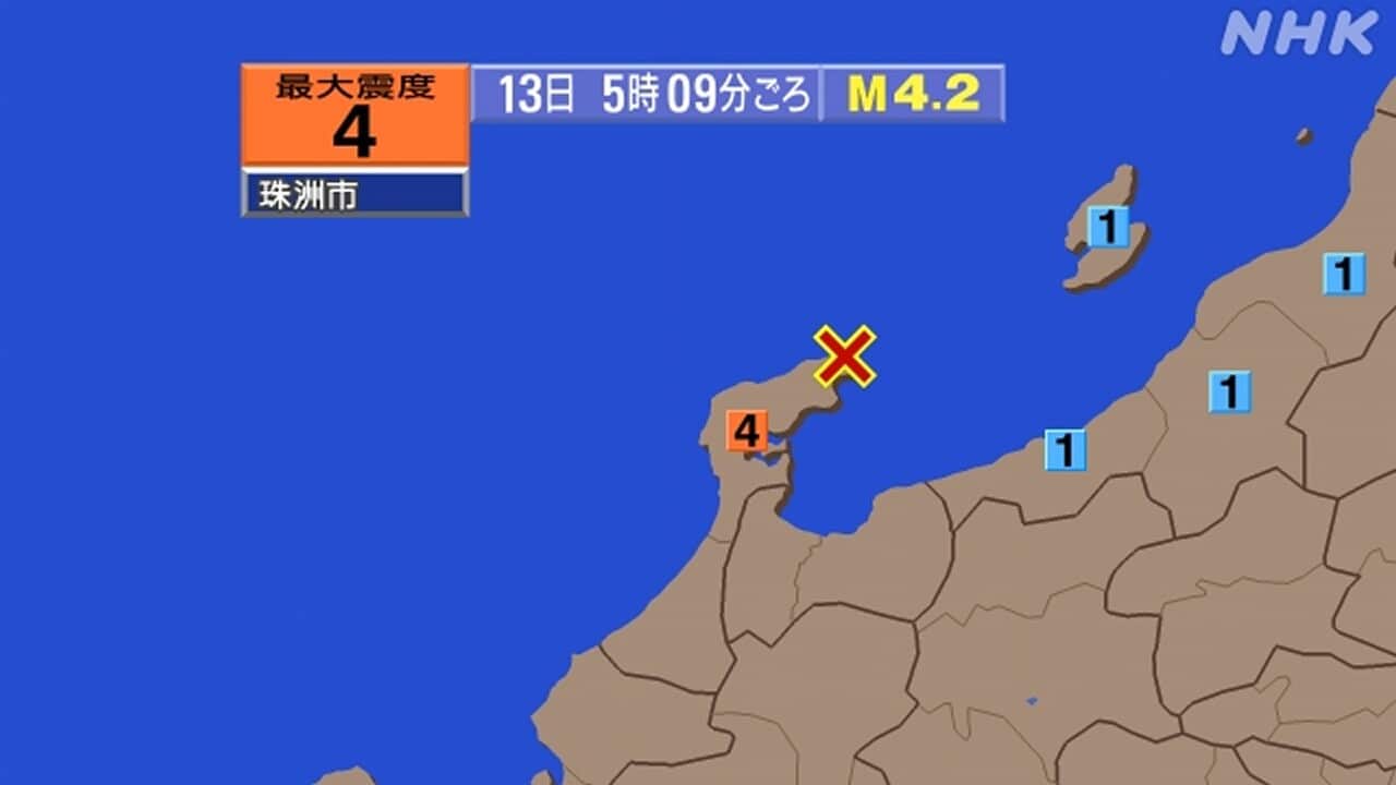 震源地は石川県能登地方で震源の深さは10キロ、地震の規模を示すマグニチュードは4.2と推定されます。