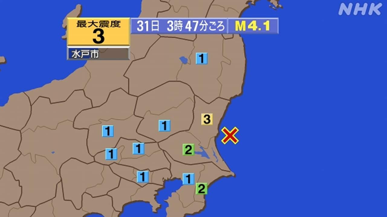 31日午前3時47分ごろ、茨城県で震度3の揺れを観測する地震がありました。この地震による津波の心配はありません。