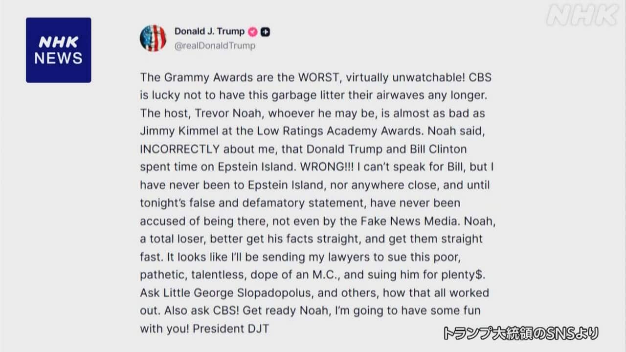 トランプ大統領 グラミー賞司会者を提訴の考え ジョークに激怒