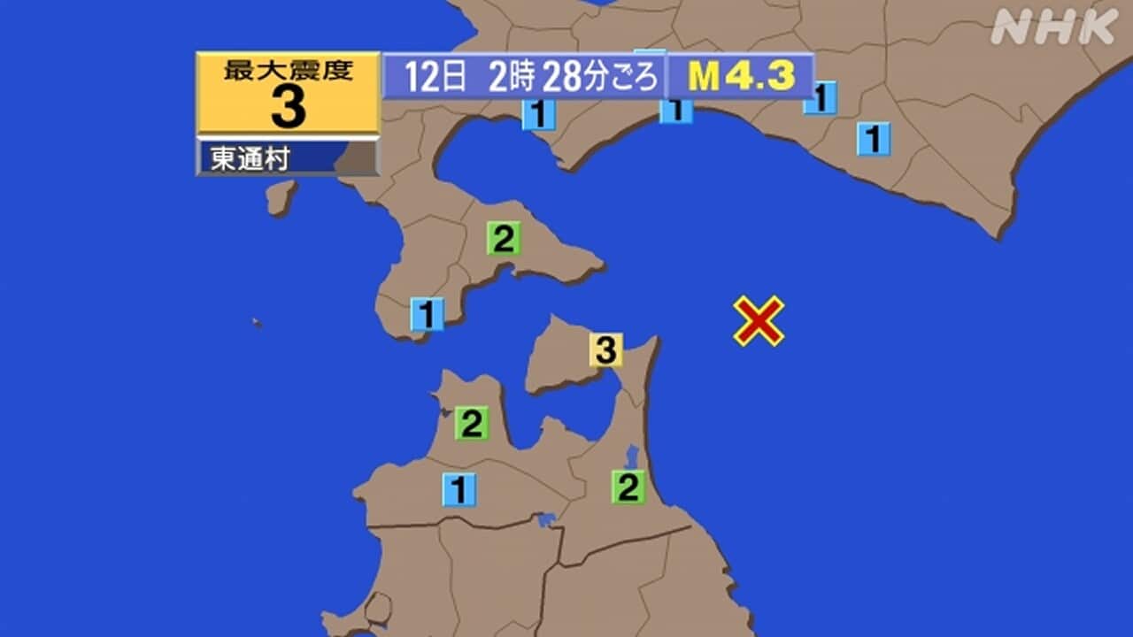 12日午前2時28分ごろ、青森県で震度3の揺れを観測する地震がありました。この地震による津波の心配はありません。