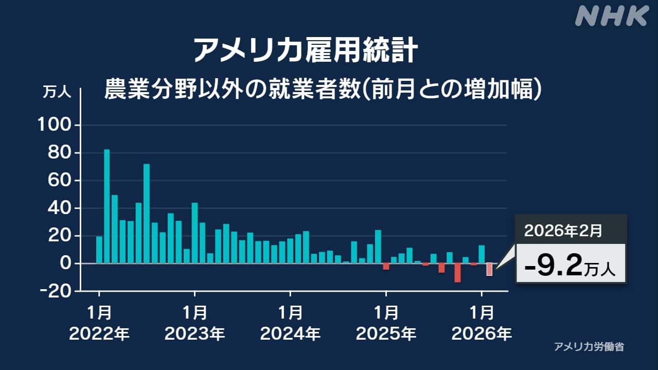 米 2月雇用統計 就業者は前月比9万2000人減 大幅な減少に