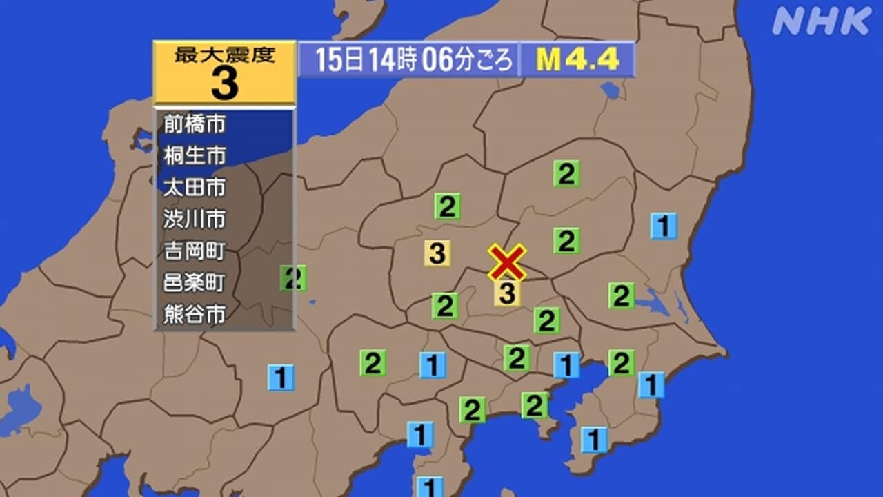 15日午後2時6分ごろ、群馬県と埼玉県で震度3の揺れを観測する地震がありました。この地震による津波の心配はありません。