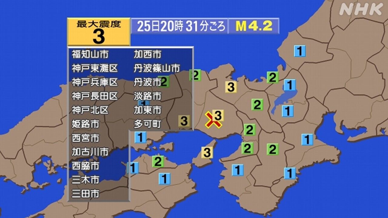 きょう午後8時31分ごろ兵庫県と京都府で震度3の揺れを観測する地震がありました。この地震による津波の心配はありません。