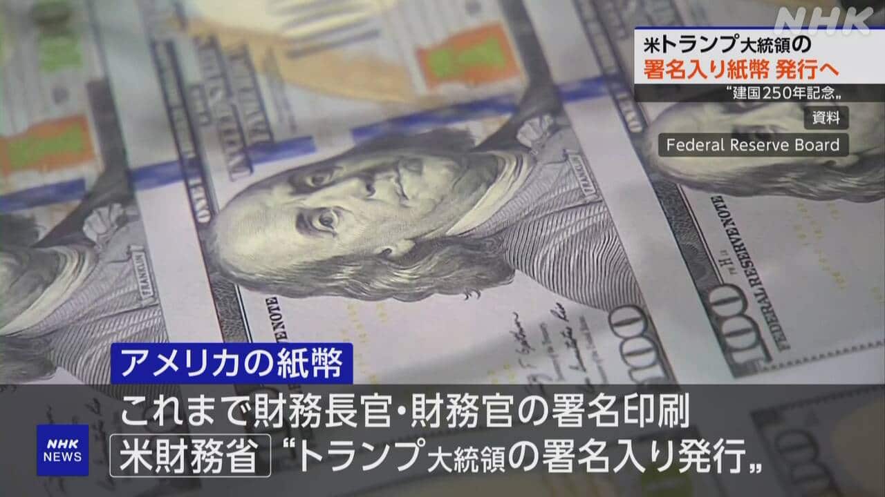 アメリカ財務省は、トランプ大統領の署名が入った紙幣を発行すると発表しました。現職の大統領の署名が印刷されるのは初めてで、建国250年の記念だとしています。