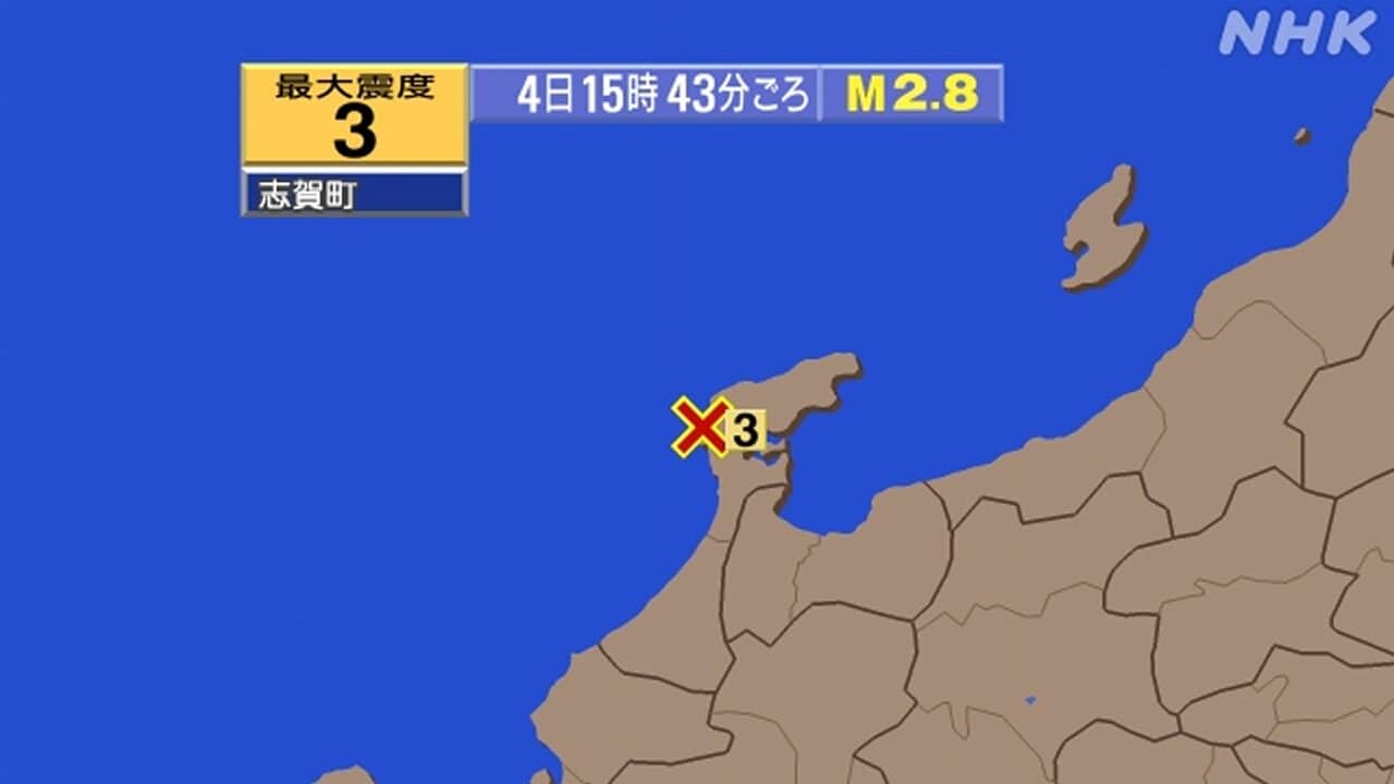 4日午後3時43分ごろ、石川県で震度3の揺れを観測する地震がありました。