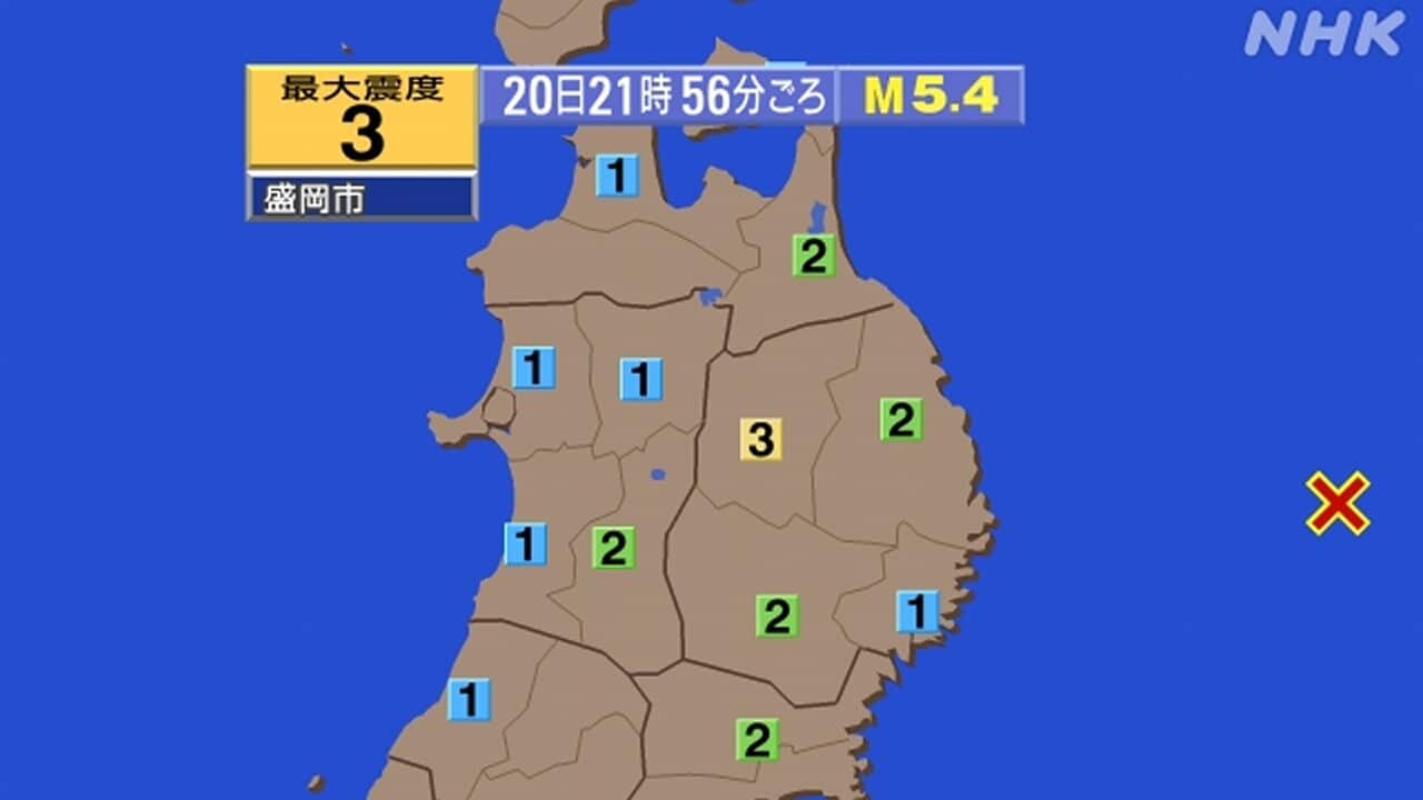 20日午後9時56分ごろ、岩手県で震度3の揺れを観測する地震がありました。