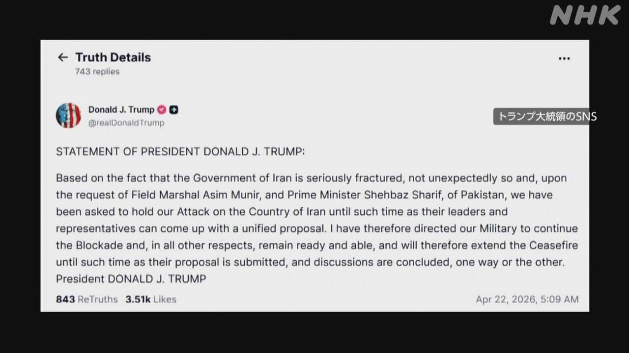 トランプ大統領 停戦延長と投稿 イランとの協議が結論至るまで