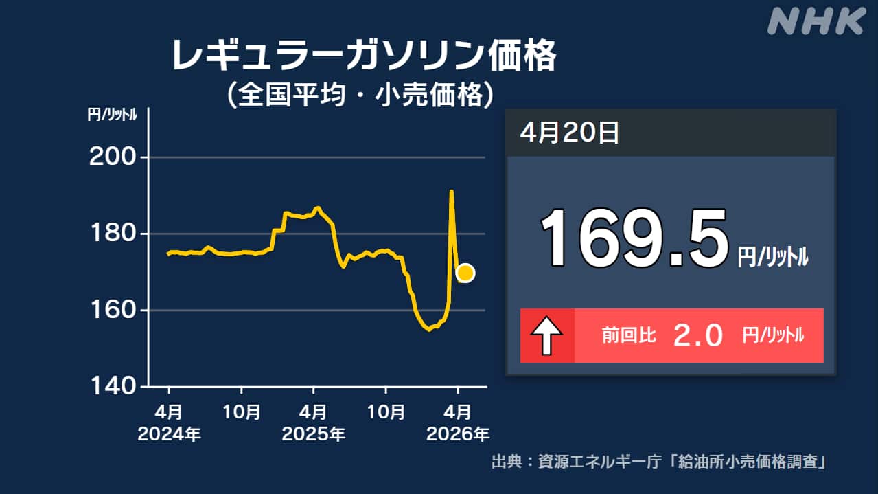 レギュラーガソリンの小売価格は20日時点の全国平均で1リットルあたり169.5円と前の週より2円値上がりしました。政府による激変緩和措置で170円程度の水準が続いています。