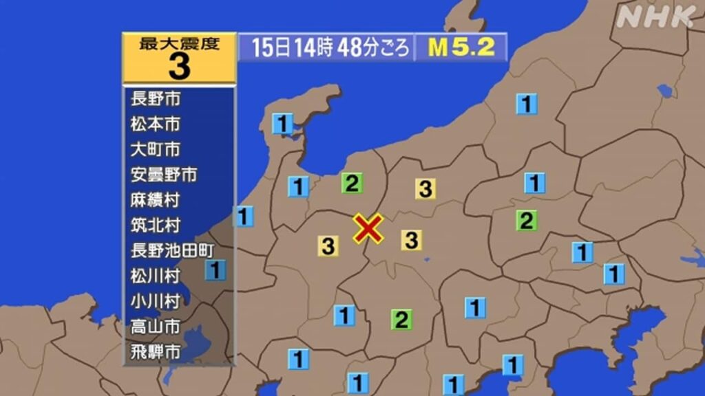 【地震情報】長野県と岐阜県で震度3 津波の心配なし