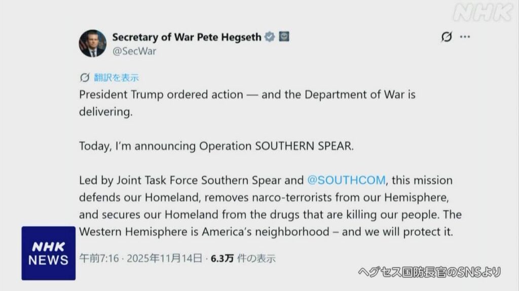 米国防長官 “麻薬テロ組織の排除作戦行っている”